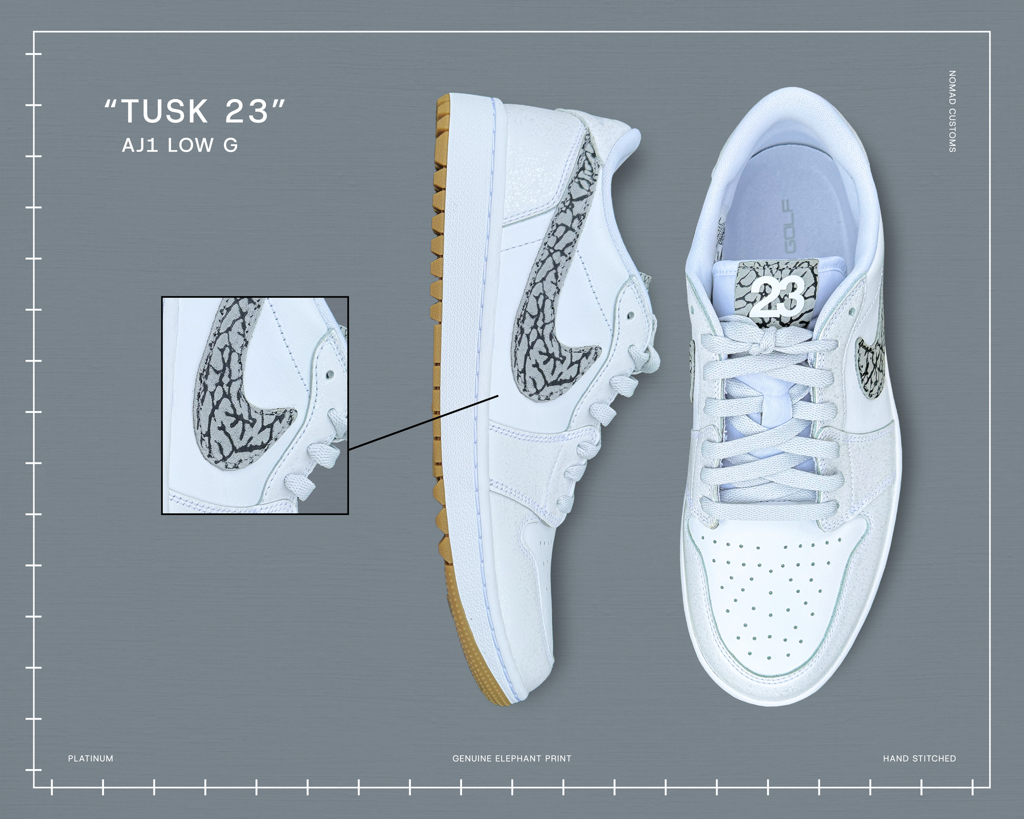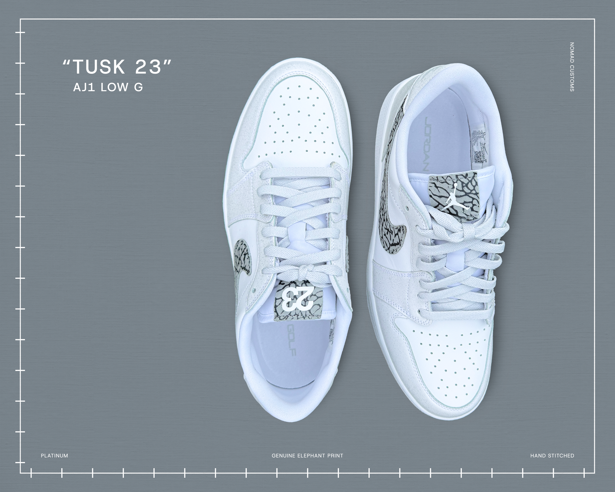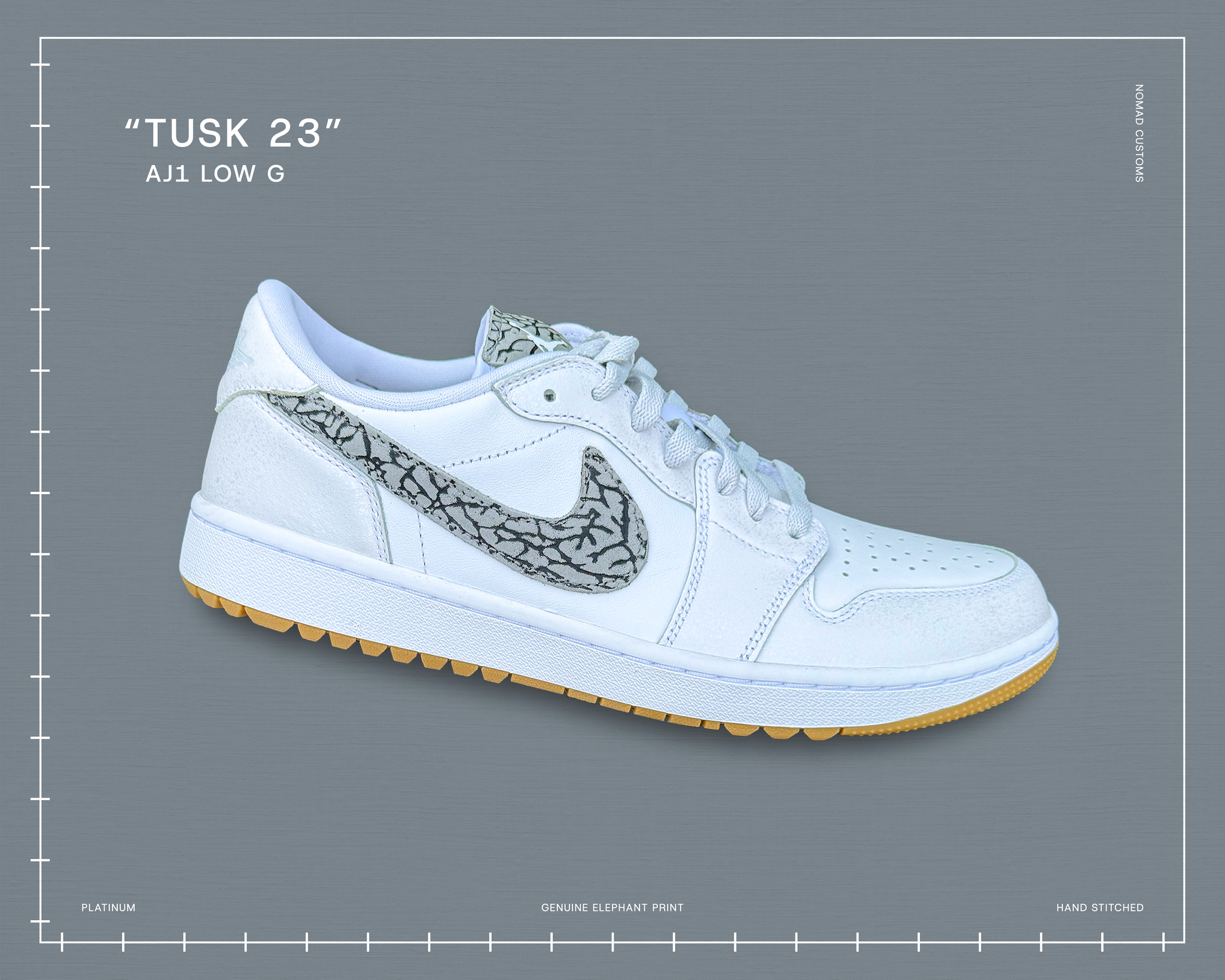 Jordan 1 Low Golf. Custom Genuine leather “Elephant Print” swooshes and tongue tags Jumpman/23 in the white/platinum/gum colorway. Designed to stand out on and off the course.